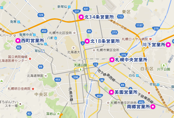 | 【北海道・札幌地区】 | 札幌中央営業所|北34条営業所|北18条営業所|美園営業所|西町営業所|南郷営業所|川下営業所| |